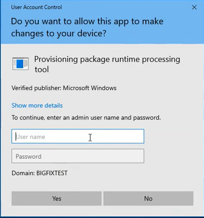 - 1 回限りの管理者パスワードを使用したユーザーによる登録: この方法では、管理者権限のないデバイス・ユーザーは登録 URL 経由でログインし、そこから .ppkg をダウンロードします。.ppkg ファイルを実行して登録を開始するには、デバイス・ユーザーに 1 回限りの管理者パスワードが必要となります。登録後、管理者はパスワードをリセットできます。