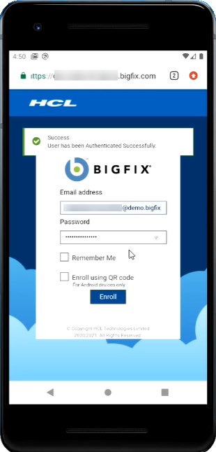- Android デバイスで、Web ブラウザーを開き、MDM サーバー URL (例: www.mdm.bigfix.com\enroll) を入力します。