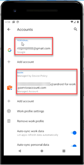 - BYOD デバイスに MDM が正常にインストールされた後で、に移動すると、個人用と仕事用の 2 つのプロファイルが表示されます。