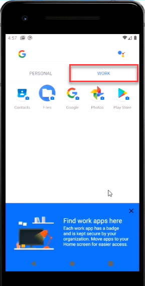 つのタブが表示されます。仕事用プロファイルでは、関連付けられたポリシー・グループに基づくアプリケーションのみ表示されます。