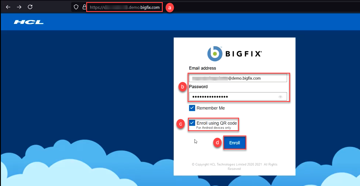 登録する Android デバイス以外の別のデバイスから、BigFix 登録 URL にログインして、QR コードを生成します。