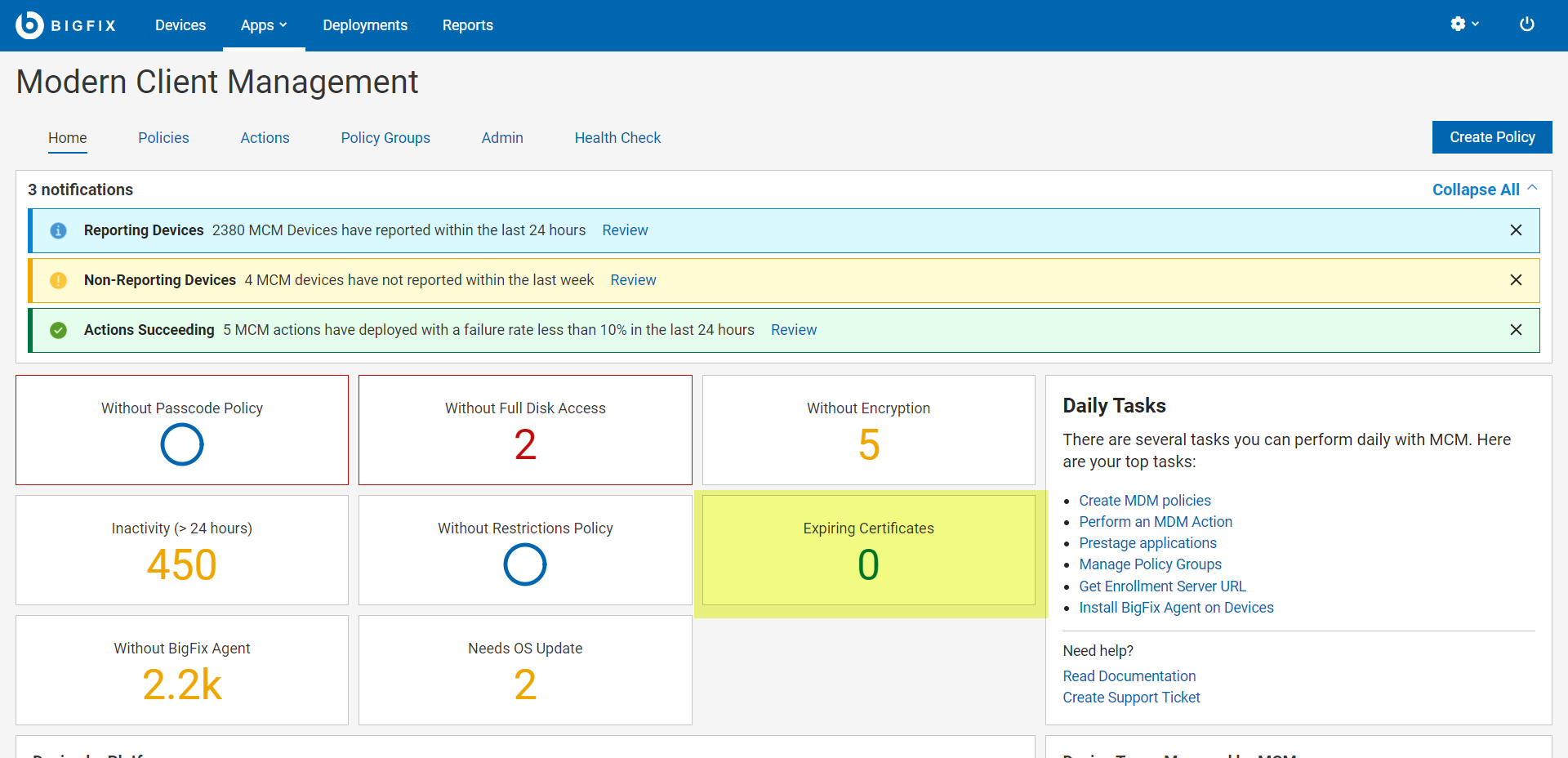 対象のターゲットが選択されたポリシー・アクションとして Fixlet Update Apple Enrollment Profile before Expiration をセットアップすると、ターゲットの Apple デバイスのデバイス ID 証明書の有効期限を表示できます。WebUI Modern Client Management ダッシュボード は証明書の有効期限が近いデバイスについて、WebUI ユーザーに通知します。