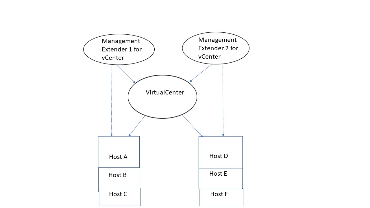 以下の図は、Patch for VMware ESXi が大規模環境で動作してワークロードのバランスを最適化するためにどのように設計されているかを視覚的に示したものです。これらの環境では、同じ Virtual Center が 2 つ以上の Management Extender によって管理されています。