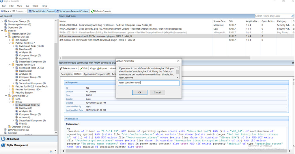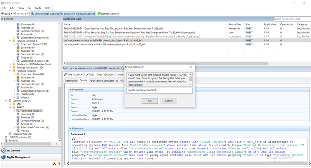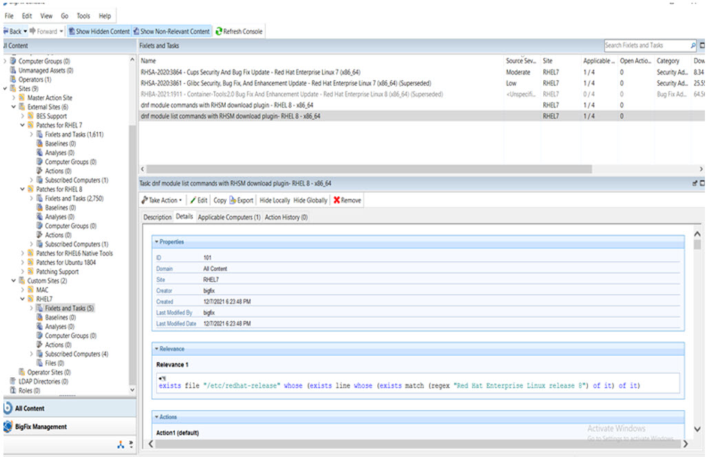 - エンドポイントでモジュラー・ストリーム・バージョンを有効または無効にするために使用される Fixlet の「dnf module commands with RHSM download plugin - RHEL 8 - x86_64.bes)」を開発しました。