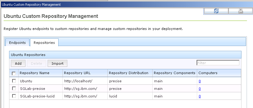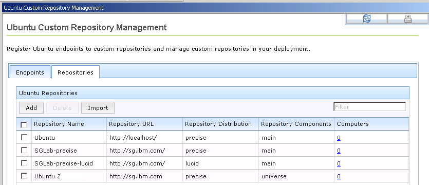 Ubuntu カスタム・リポジトリー管理ダッシュボードを使用して、リポジトリーを追加できます。