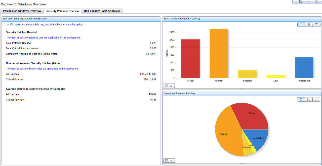「セキュリティー・パッチの概要」タブには、重大度 (きわめて重要、重要、中程度、重要度が低い、未分類) 別の必要なパッチの合計数の棒グラフがあります。別の棒グラフには、関連するパッチの重大度が示されます。