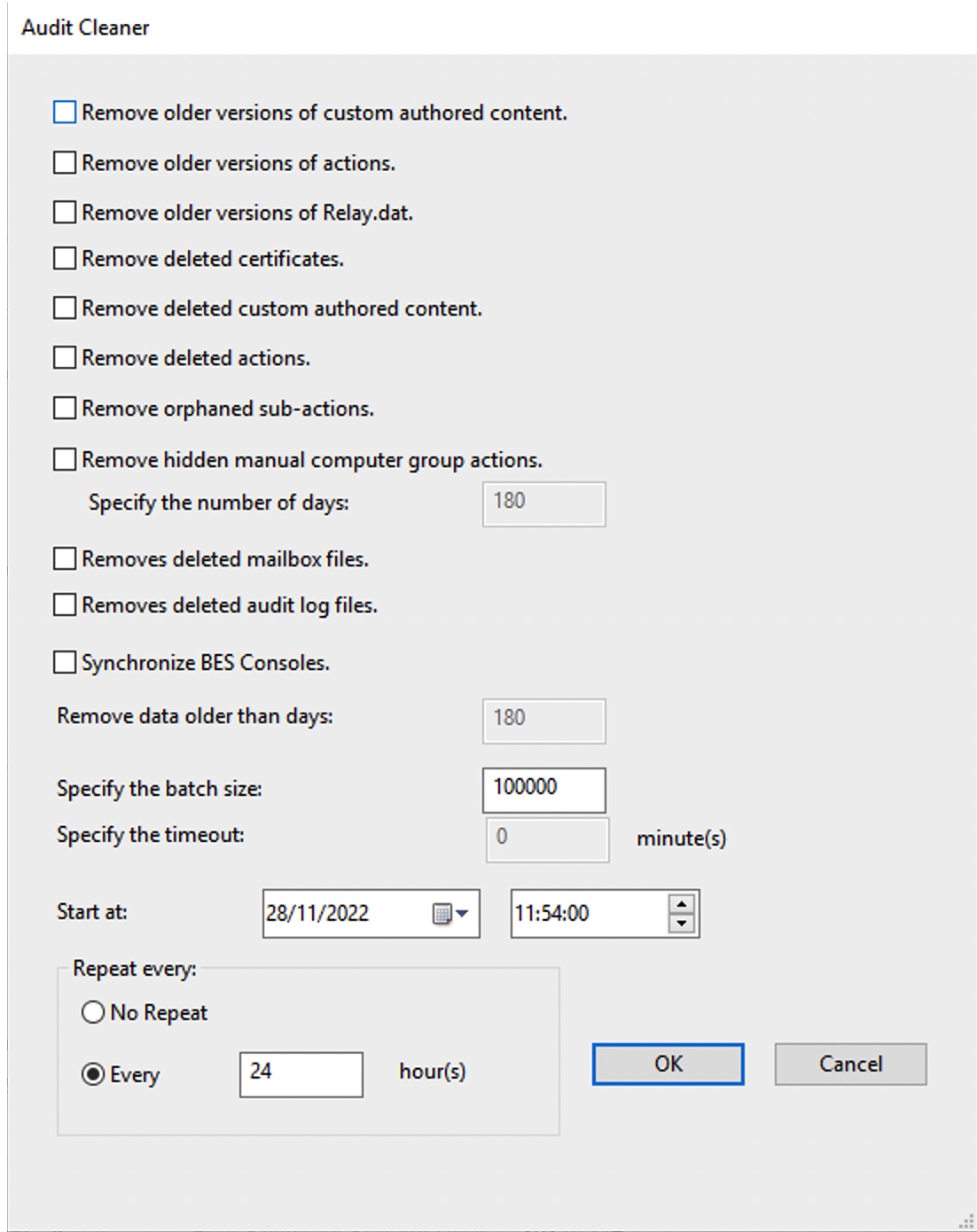 上記のすべてのデータをデータベースから自動的に削除するには、BigFix 管理ツールのBES Audit trail Cleanerで「スケジュール」をクリックします。これにより、削除処理がスケジュールされます。