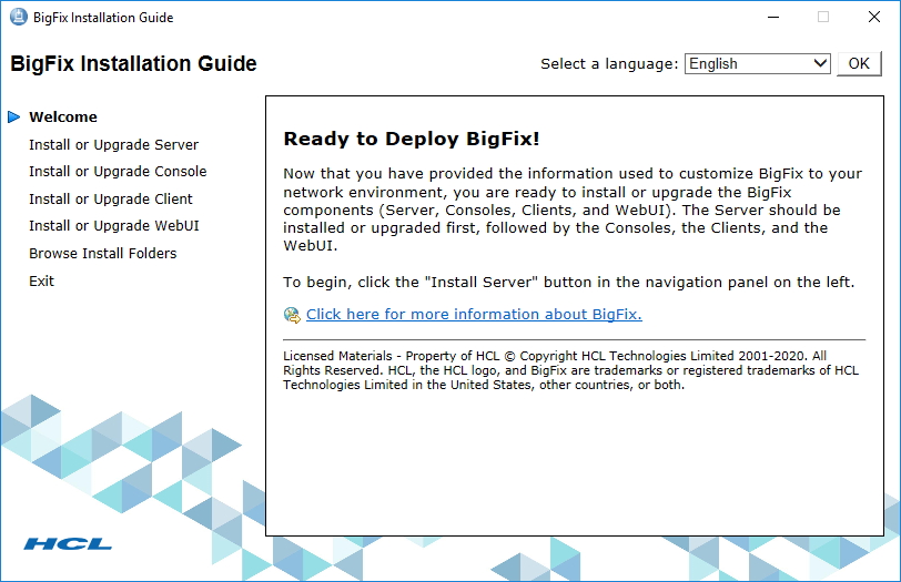 - インストール・ガイドをまだ実行していない場合は、実行します (「スタート」>「すべてのプログラム」>「BigFix」>「BigFix インストール・ガイド」)。新しいパネルが開きます。