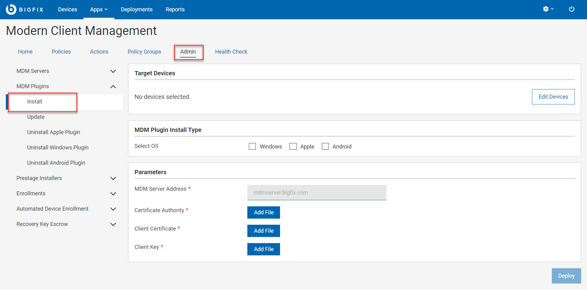 - 「対象デバイス」セクションで、「デバイスの編集」をクリックし、MDM プラグインをインストールする MDM サーバーを選択します。