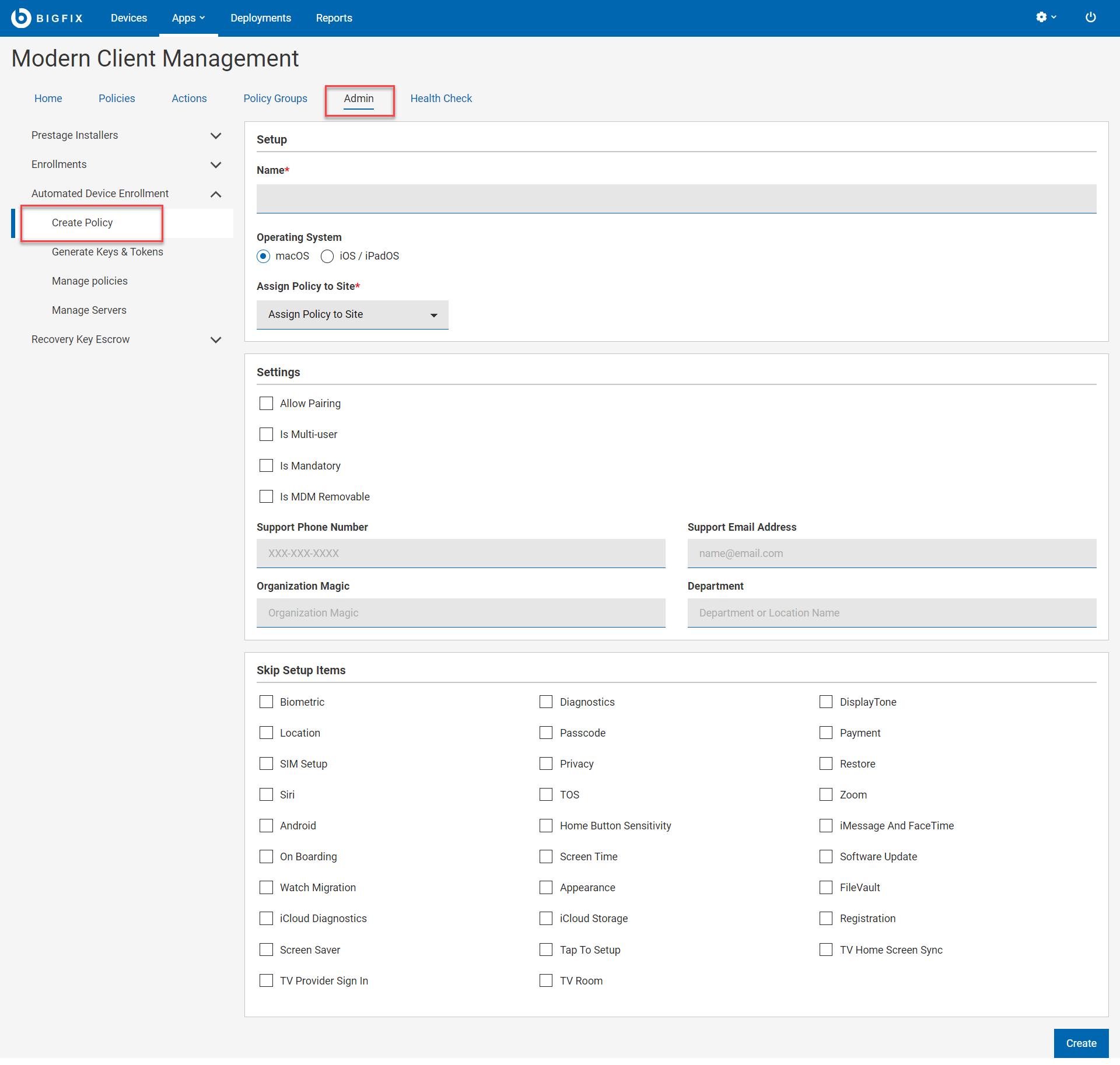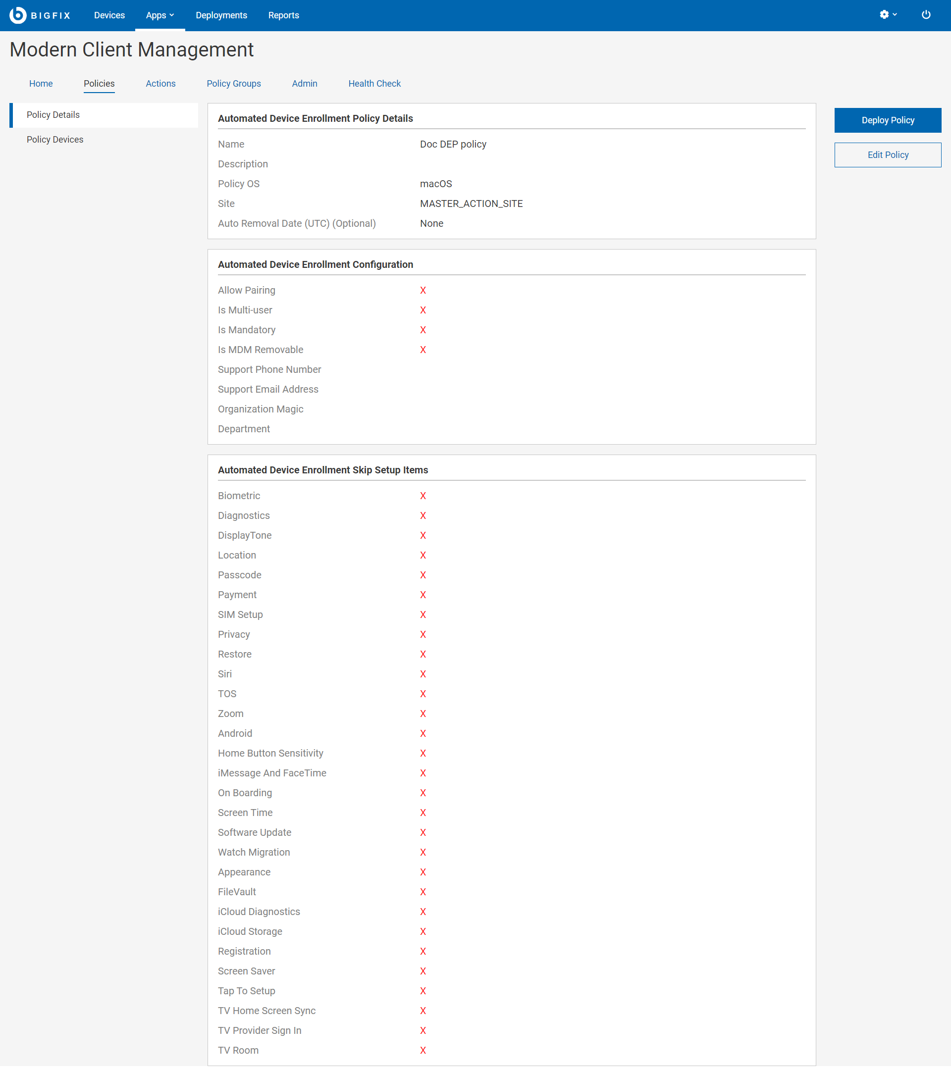 注: MDM サーバーに最後にデプロイされた DEP ポリシーのみが有効となり、以前にデプロイされたポリシーはすべて置き換えられます。DEP 登録が行われるすべてのデバイスは、登録デバイスの OS でプロファイルが有効になっていると仮定して、同じプロファイルとオプションを取得します。