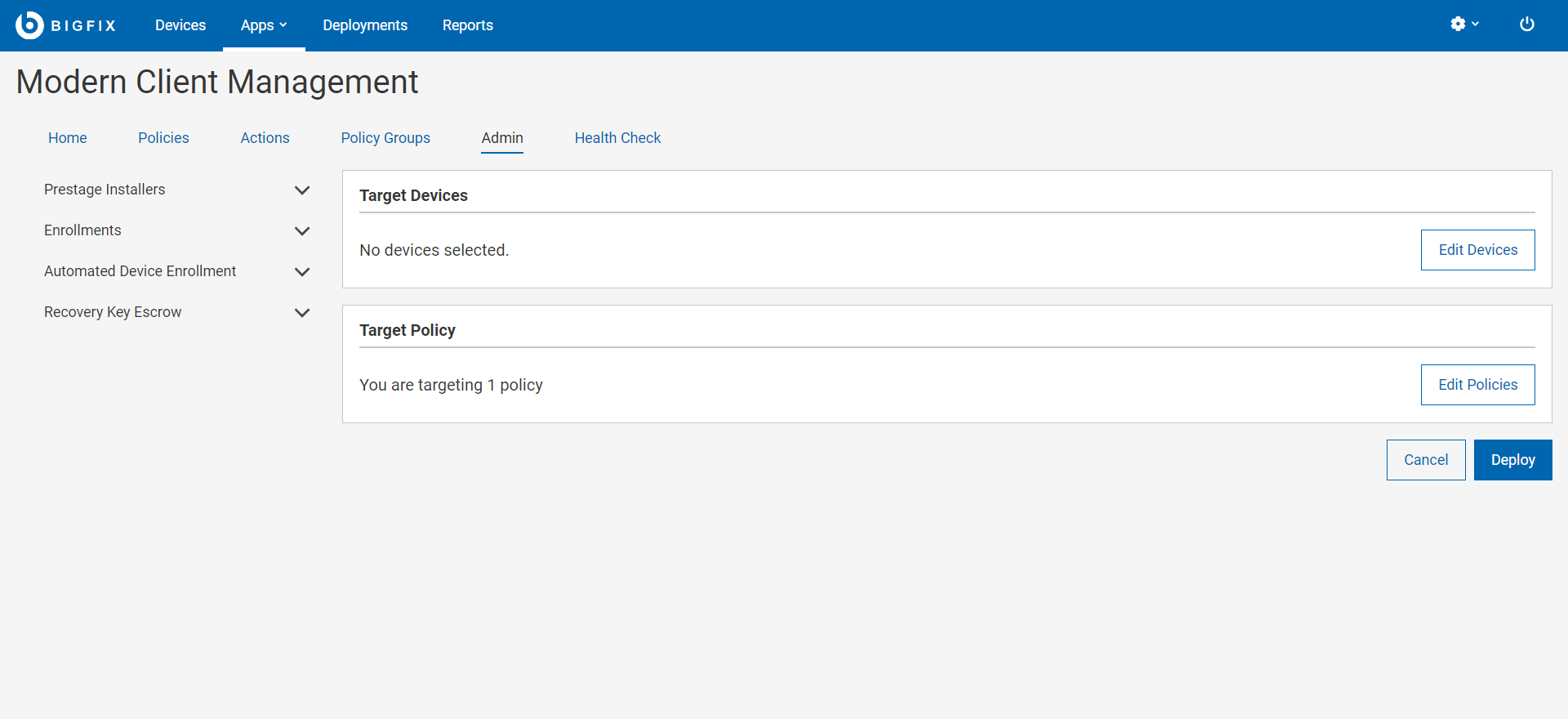 「ポリシーのデプロイ」ページで、対象デバイスを選択し、「デバイスの編集」をクリックします。次のポップ・アップ・ウィンドウで、ポリシーをデプロイするデバイスを選択します。