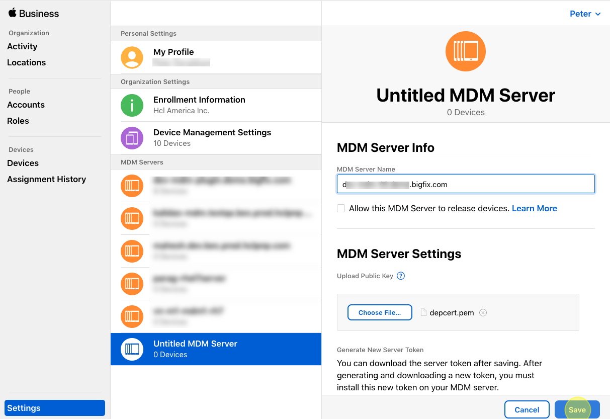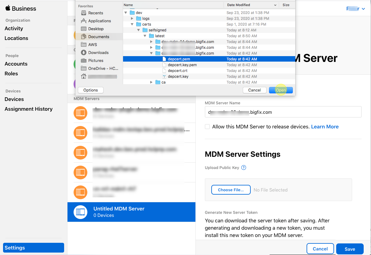 通信を確立し、デバイスの登録を管理するには、MDM サーバーを定義し、Apple Business Manager から有効な DEP トークンを取得する必要があります。
