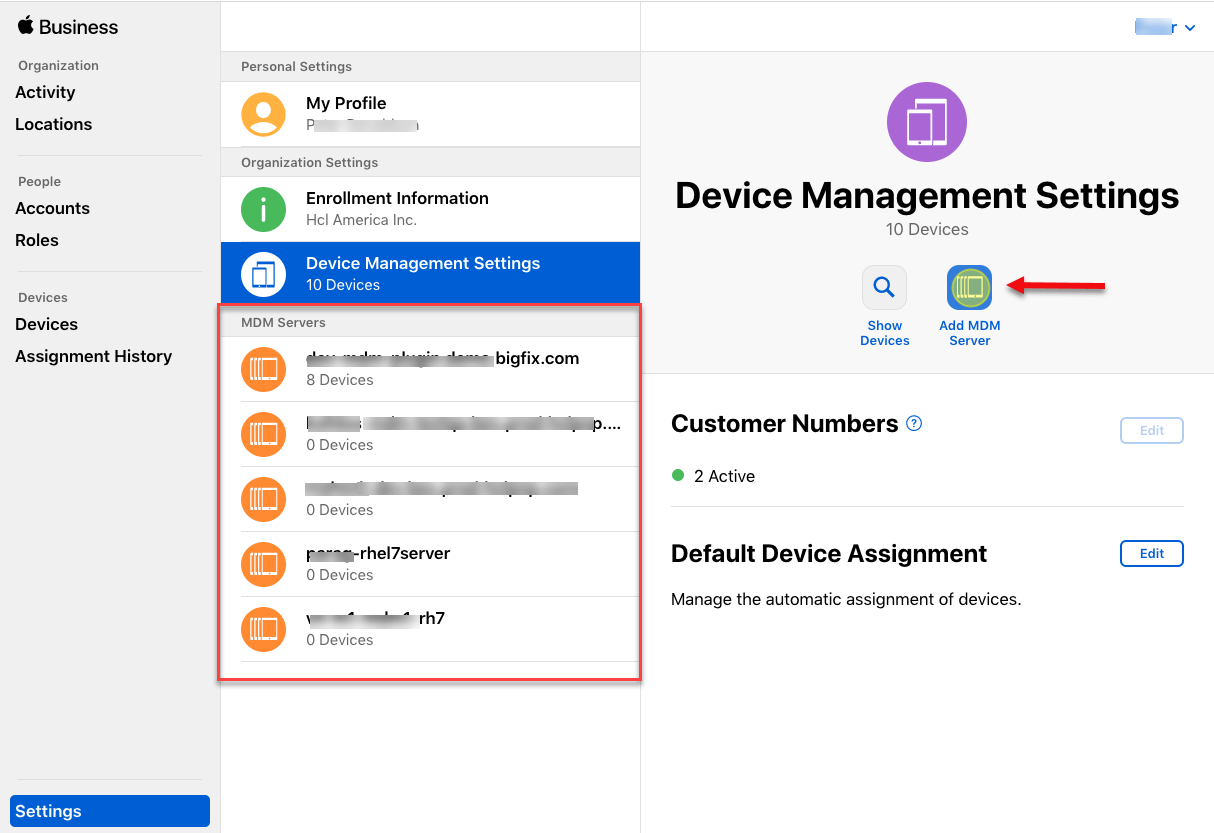 「デバイス管理設定」セクションの「MDM サーバー」で、既に定義されている MDM サーバーの一覧を確認できます。新しい MDM サーバーを定義するには、「MDM サーバーの追加」をクリックします。
