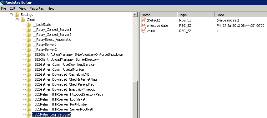- HKEY_LOCAL_MACHINE\SOFTWARE\Wow6432Node\BigFix\EnterpriseClient\Settings\Client にレジストリー・キー _BESRelay_Log_Verbose を追加します。