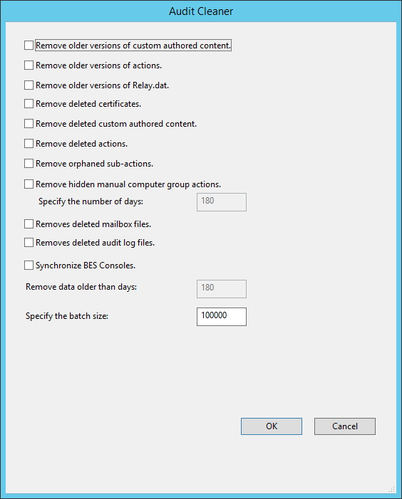 このツールにより、監査証跡として使用される履歴データを BFEnterprise データベースから消去することができます。監査証跡には、削除されたバージョンと古いバージョンの Fixlet、タスク、ベースライン、プロパティー、メールボックス、アクション、および分析が保管されます。