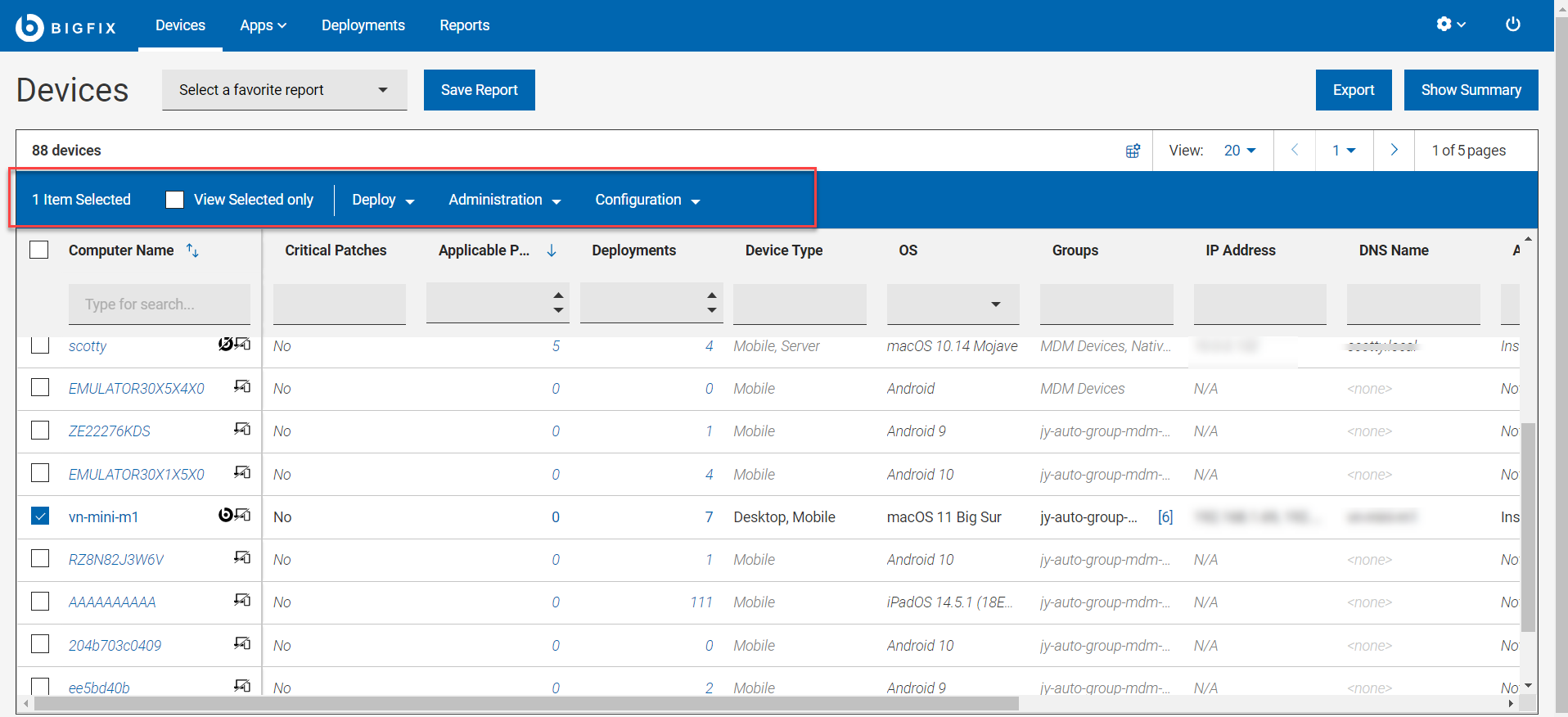 - デプロイメント用のデバイスまたはコンテンツを選択すると、青色のアクション・バーが表示されます。
