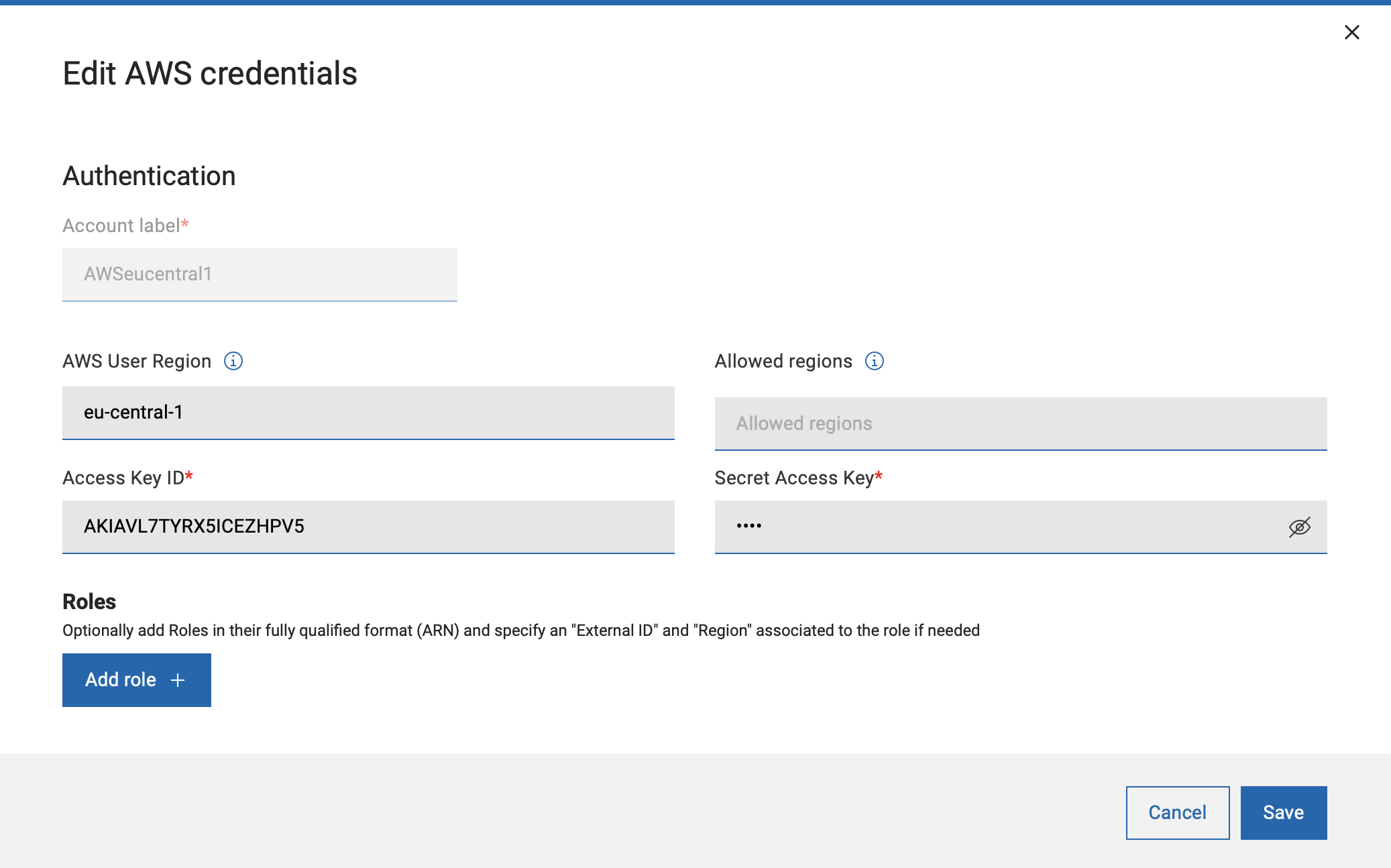 「ロールの追加」を押すと、ロールの完全修飾 ARN、クラウド管理者から提供された場合は外部 ID、AWS API でディスカバリーを開始するために必要なデフォルトの地域が含まれるテーブルが表示されます。これらのフィールドはすべてオプションですが、外部 ID または地域が指定されている場合は ARN が必要です。