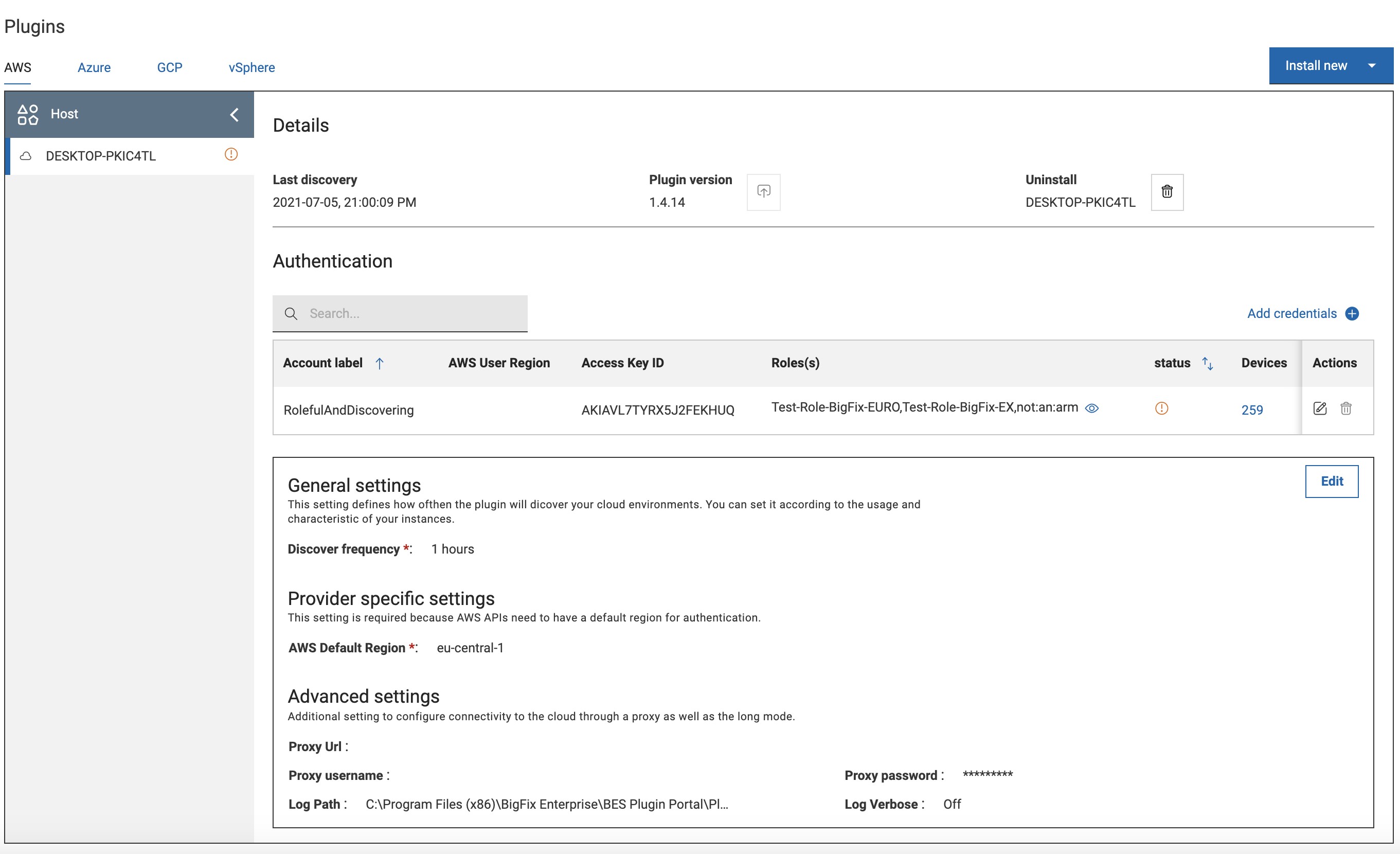 初回のインストール後に、さらに資格情報を追加することや、既存の資格情報を編集または削除することができます。「一般設定」セクションでは、ディスカバリーの頻度、ロギング、プロキシーなどの、プロバイダー固有の情報を設定できます。