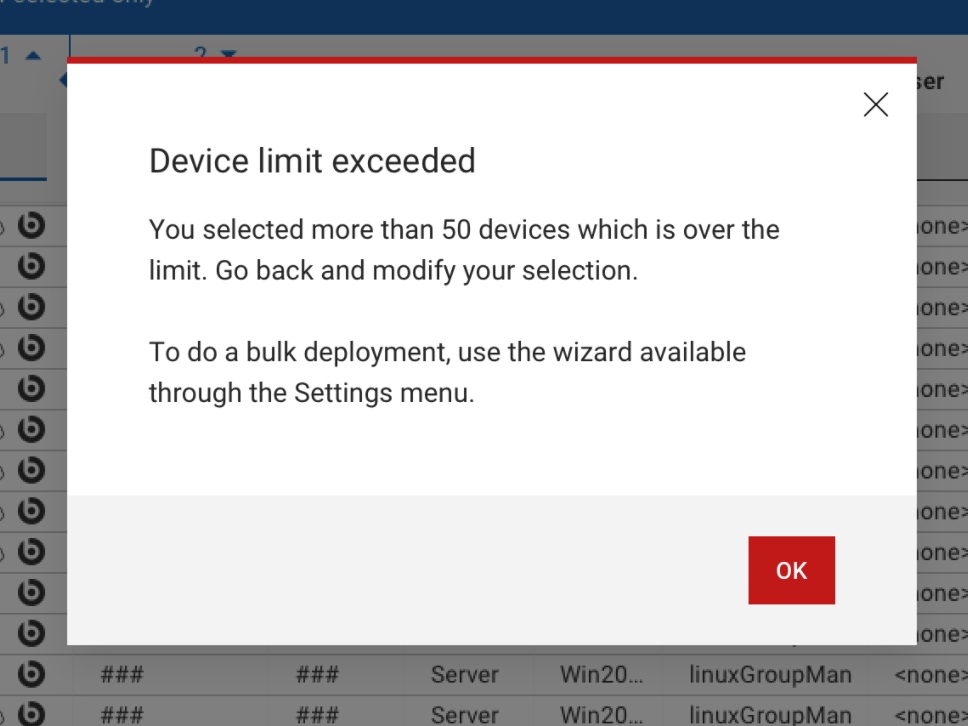 50 台を超えるデバイスを選択しました。最適なパフォーマンスを得るには、代わりにウィザードを使用して、アクションは送信されません。