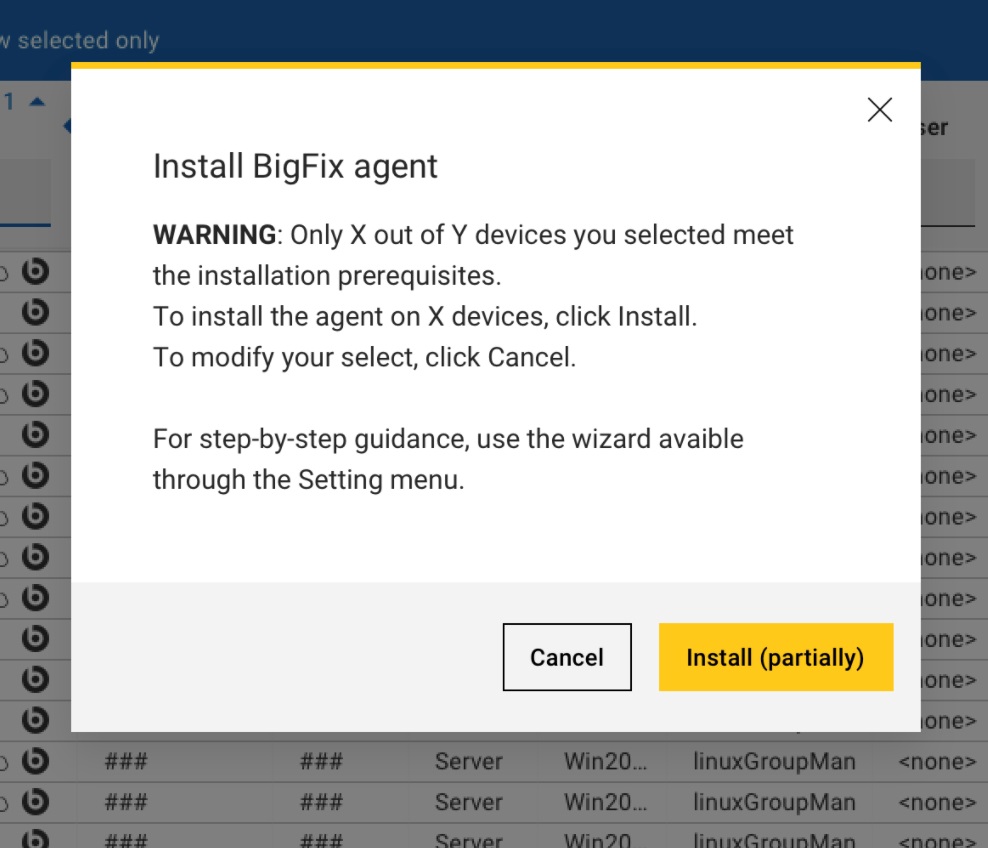 選択したデバイスのサブセットのみが、ネイティブ・インストールの前提条件を満たしています。したがって、アクションを実行すると、そのアクションはデバイスのサブセットに対してのみ送信されます。