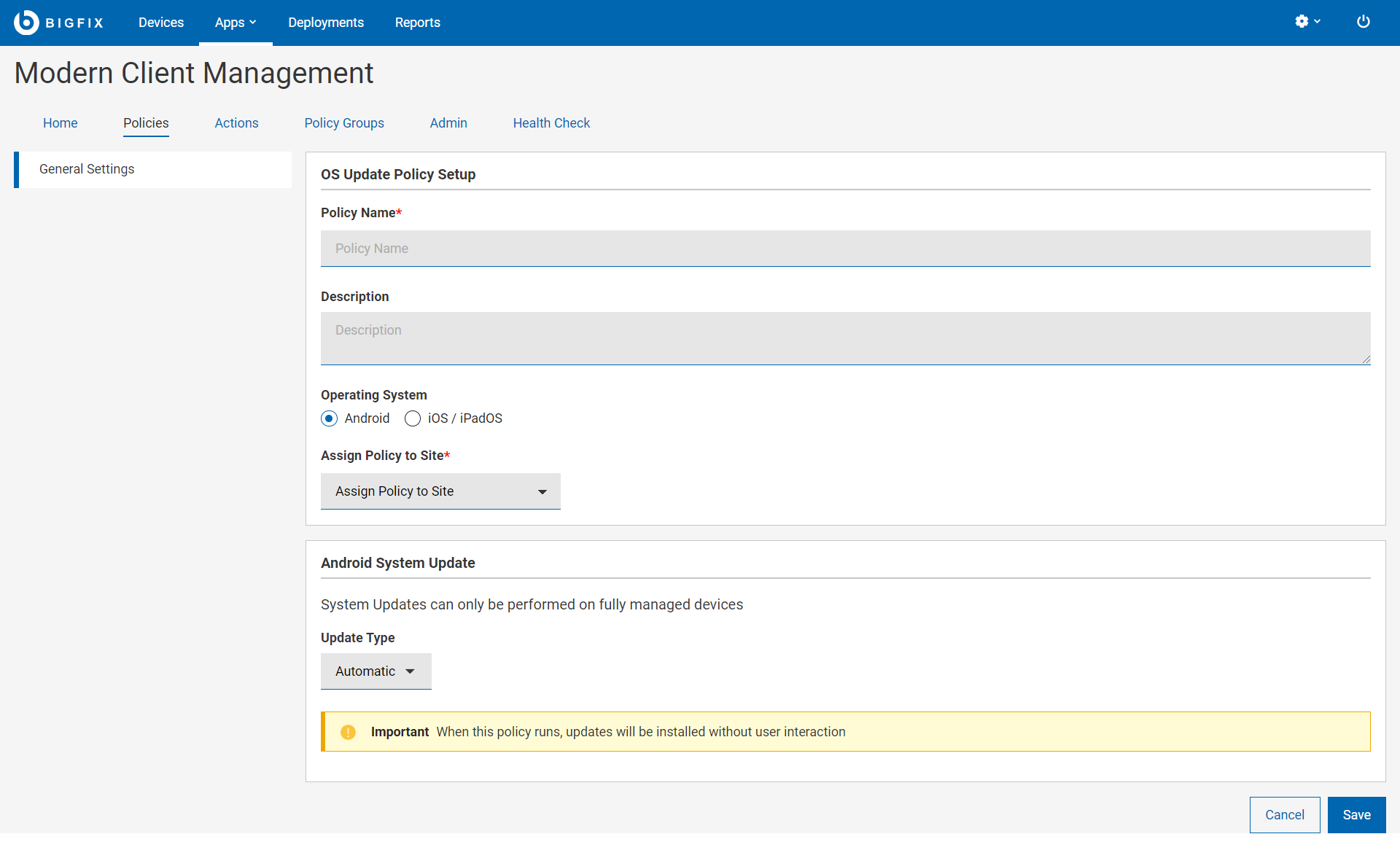 - 「一般設定」セクションで、OS の更新ポリシーの名前と説明を入力します。