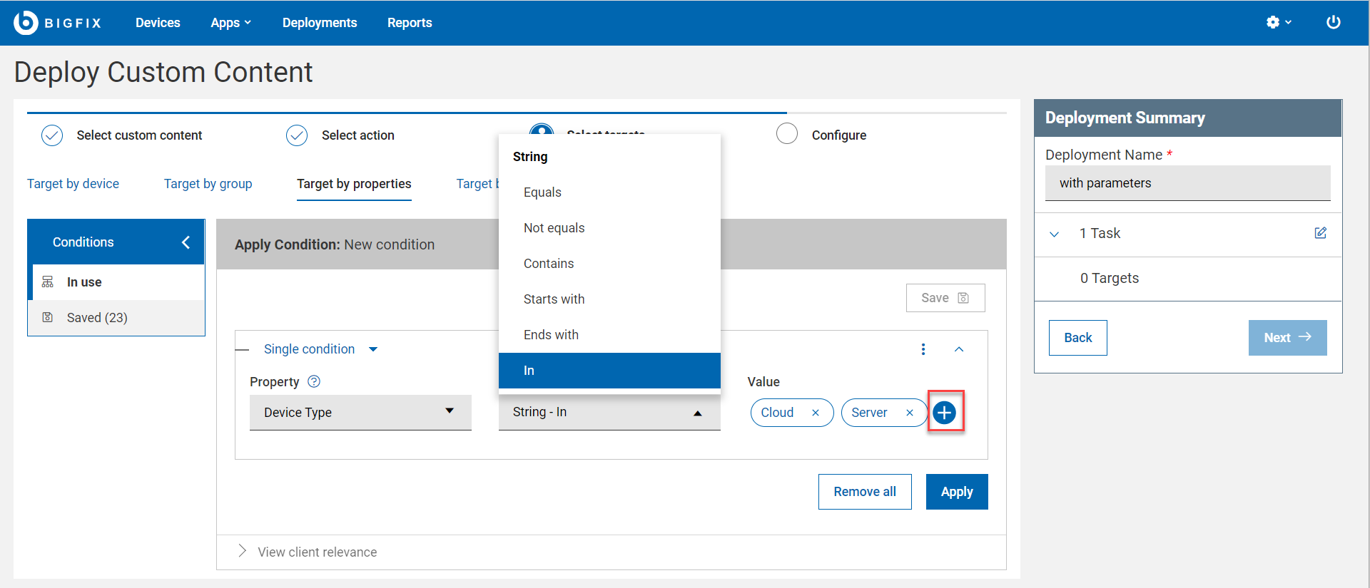 - 「適用条件」をクリックします。単一の条件を定義するか、または AND 演算子と OR 演算子を使用して条件を組み合わせて、プロパティーに基づいてターゲットをフィルタリングできます。