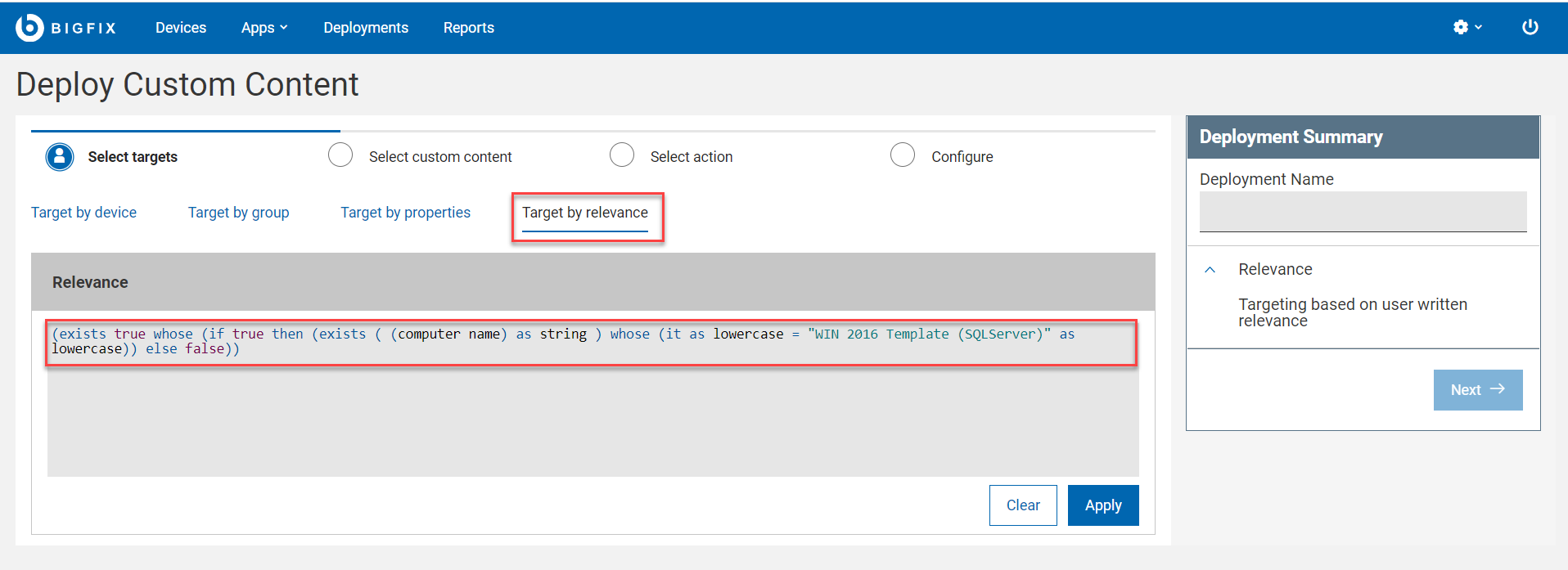 デプロイ・シーケンスで、「ターゲットの選択」アクションの関連度別にターゲット設定するタブを開き、関連度ステートメントを入力します。