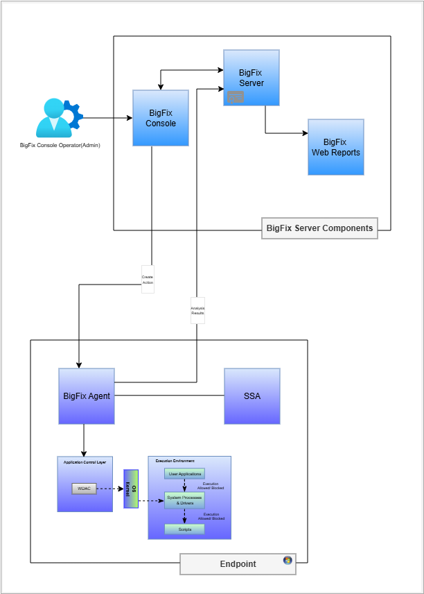 - On the endpoints the BigFix agent is installed which communicates with Application Control Layer to enforce allowlisting or blocklisting of applications using kernel-based WDAC.