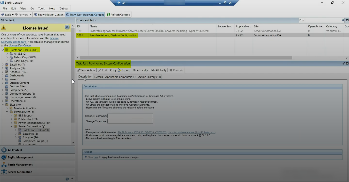 This Fixlet automates the post-provisioning configuration of AIX® LPARs and Linux™ systems by updating the hostname and/or time zone based on user-provided parameters. If parameters are left blank, the corresponding settings will remain unchanged. As this is an optional Fixlet and task, this can be used if the user intends to use it for updating; otherwise it will not be used.
