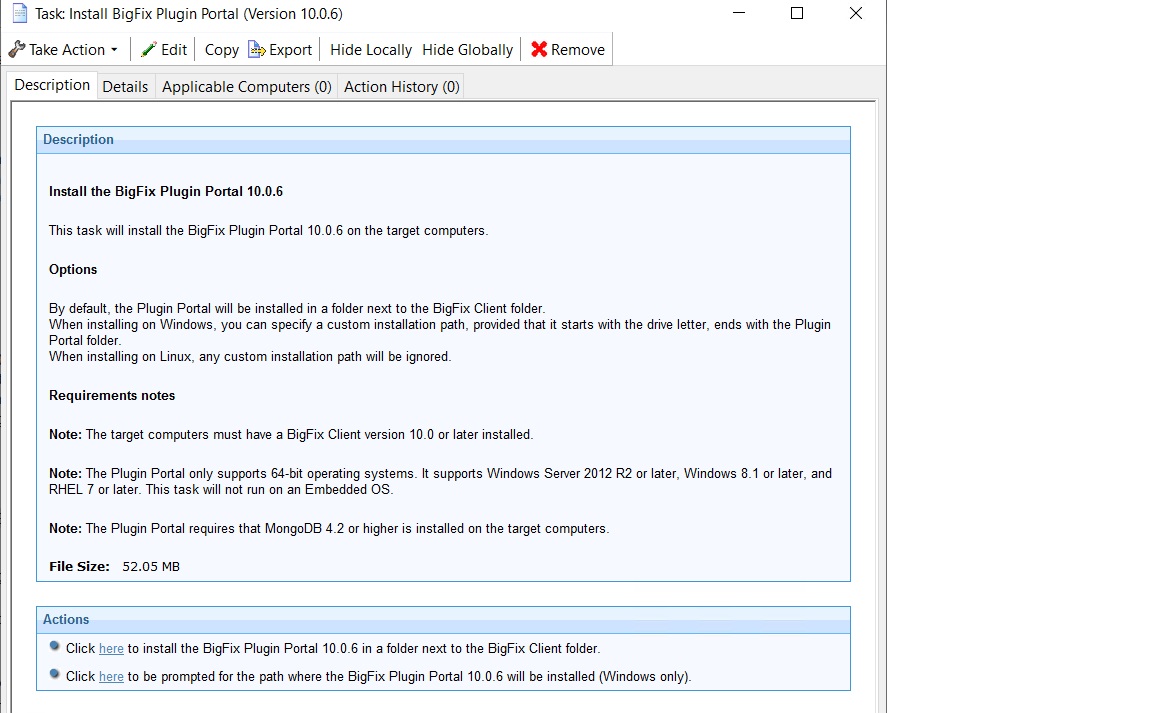 To install the Plugin Portal on a BigFix Agent, run the Task named Install BigFix Plugin Portal (Version x) from the BES Support site. This Task installs the BigFix Plugin Portal version x.x on the selected targets.