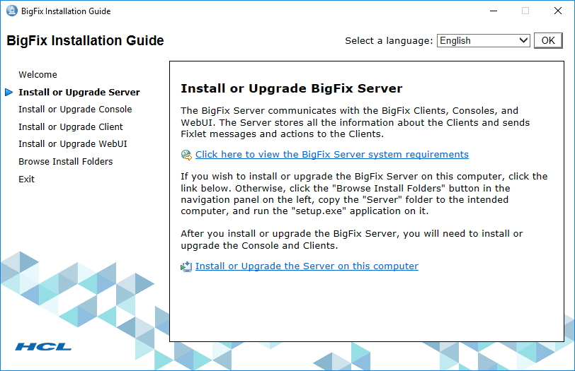 - Follow the instructions listed in Installing the clients to install the BigFix Client locally on the same Windows system where you installed the Server.