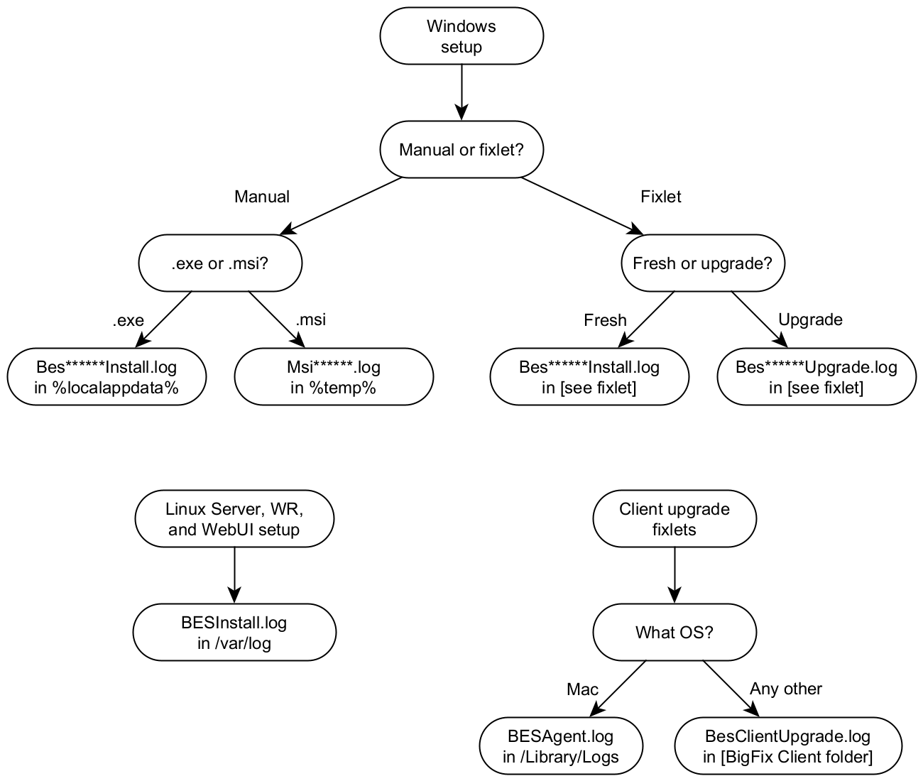 {BigFix Client folder}\BesClientDeployToolInstall.log, for the Client Deploy Tool (CDT){BigFix Client folder}\BesConsoleInstall.log, for the Console{BigFix Client folder}\BesPluginPortalInstall.log, for the Plugin Portal{BigFix Client folder}\BesRelayInstall.log, for the Relay{BigFix Client folder}\BesWebUiInstall.log, for the WebUI Service