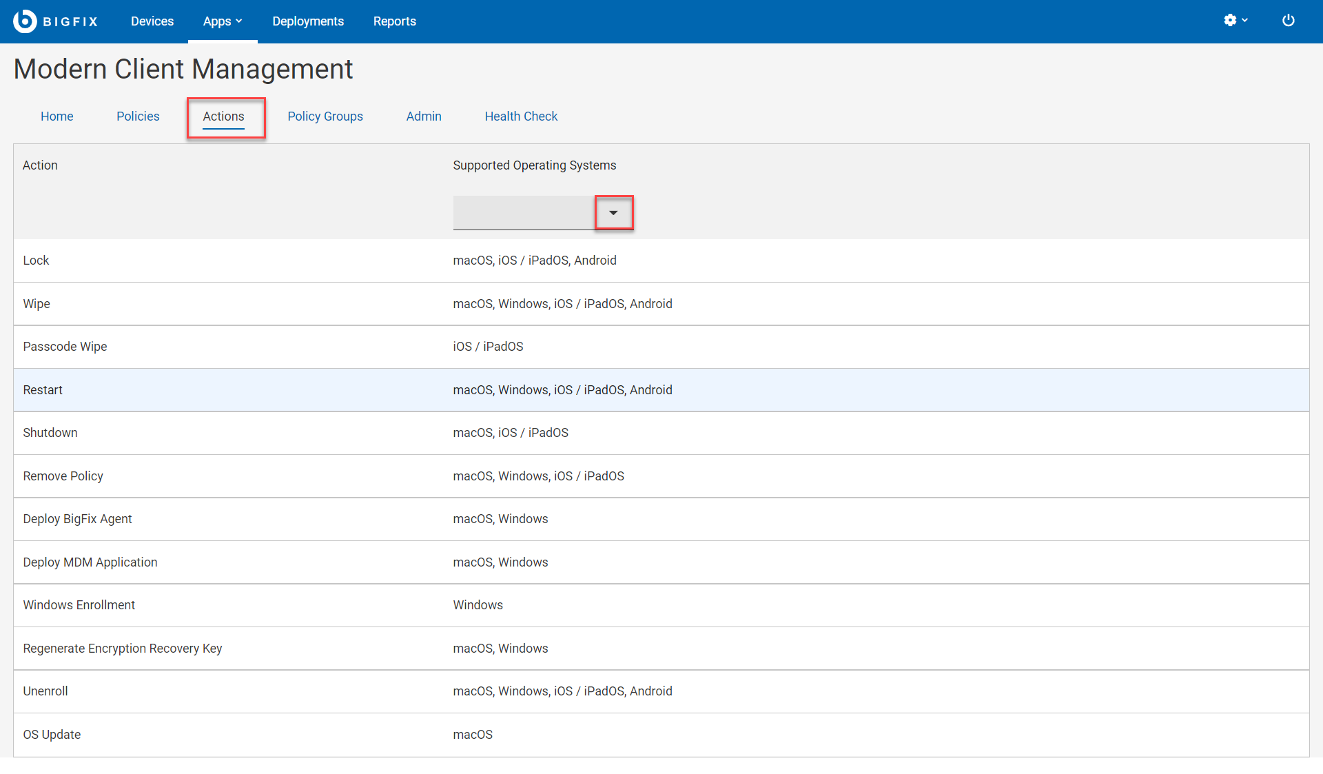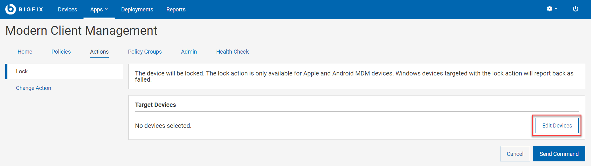 This action is available for all BigFix managed devices, regardless of whether the device is managed by MDM, by BigFix Native agent, or through cloud plugins.