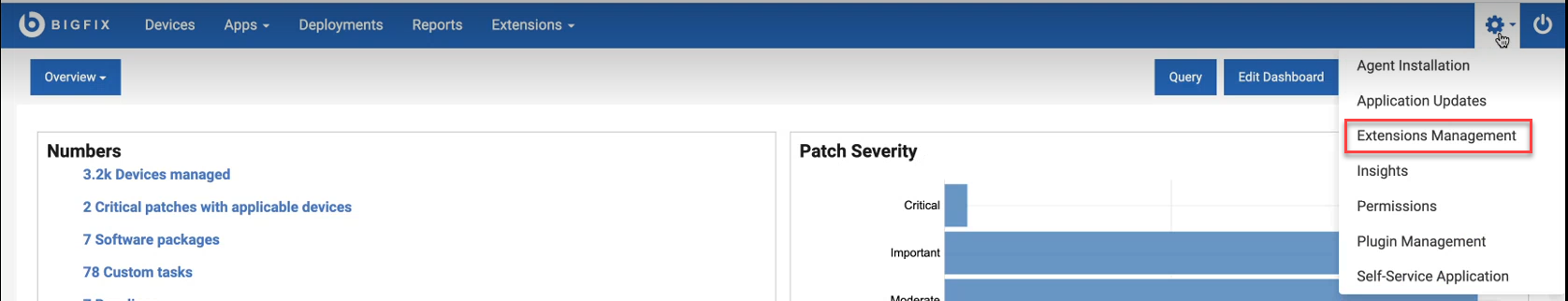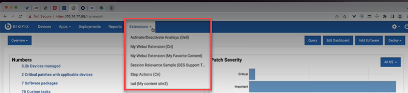 BigFix Extension Management application provides you the possibility to extend WebUI features beyond what is delivered in the products that you are currently entitled to. You can address specific use cases that are not currently fulfilled by the product by adding ad-hoc extensions to WebUI.