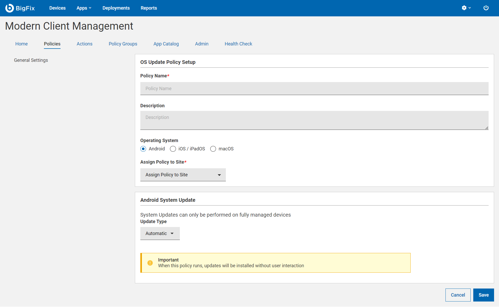 - Under the General Settings section, enter the OS update policy name and description.