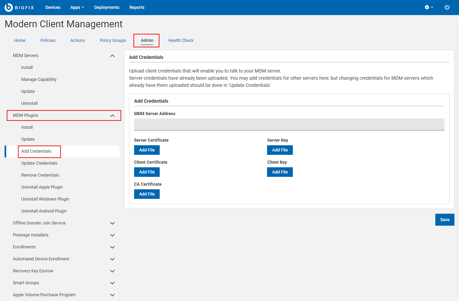 - MDM Server Address: Enter the address of the MDM server for which you want to add the credentials. For example, mdmserver.deploy.bigfix.com.