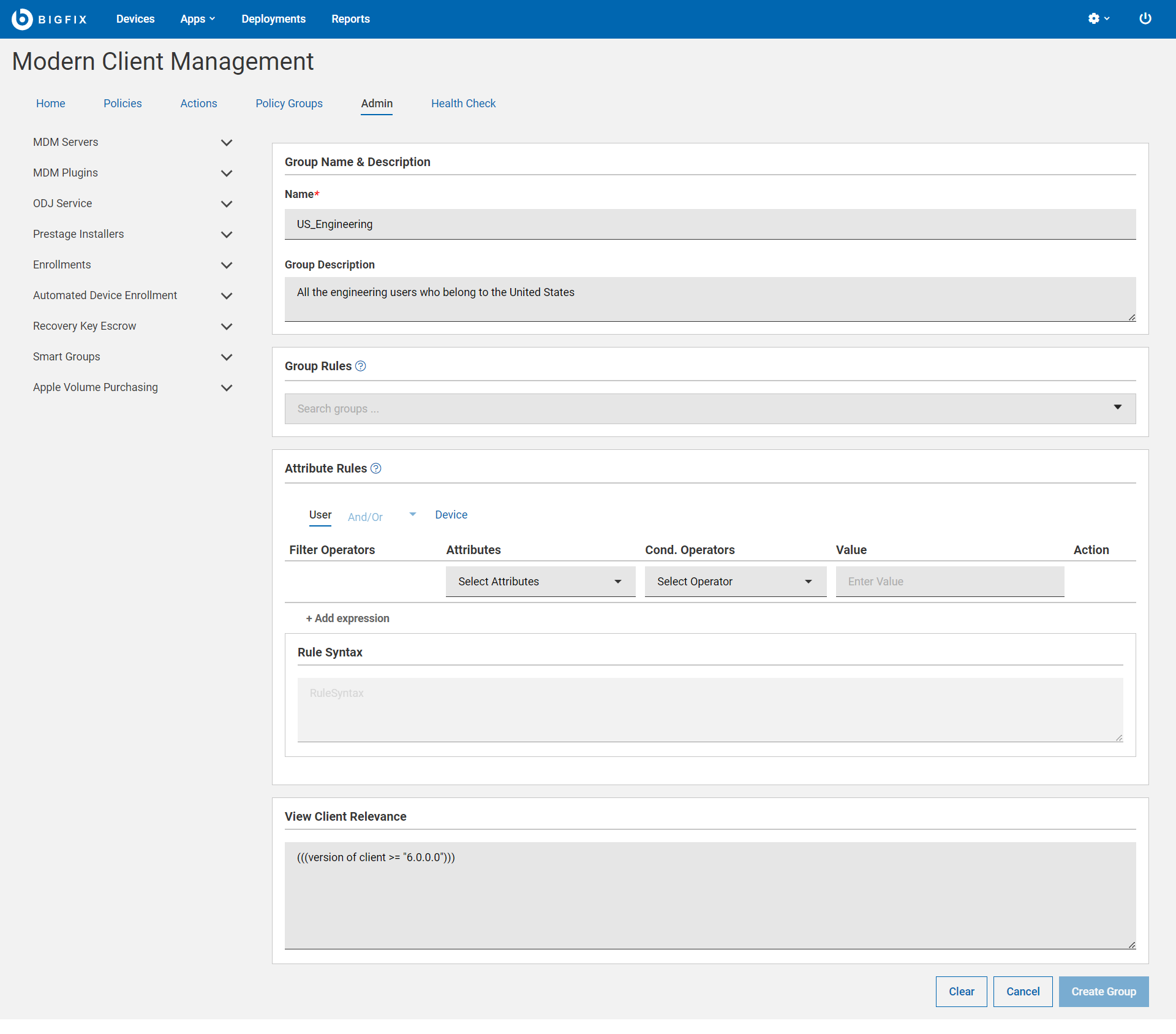 The View Client Relevance section dynamically displays the relevance statement according to your rule definition.