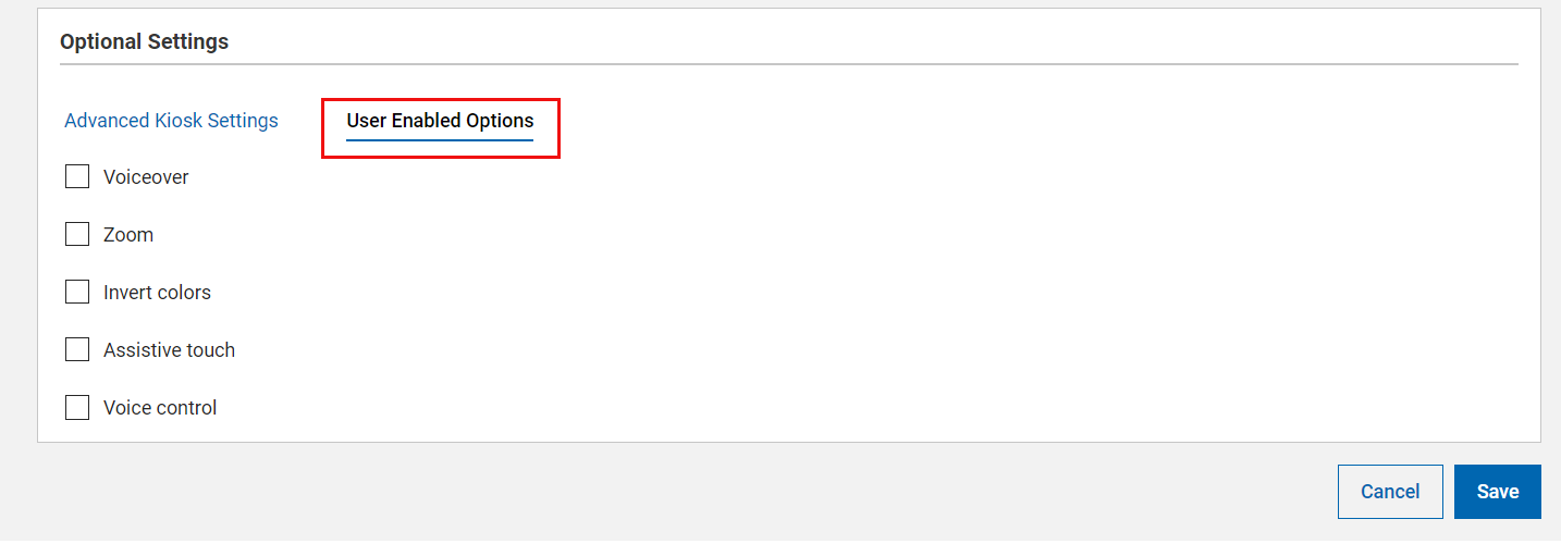 You can configure the following optional settings for single app kiosk mode from this page:
