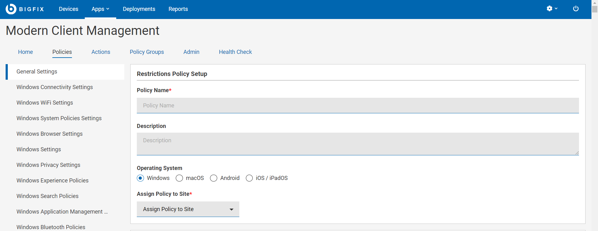 - All operating systems have specific set of restrictions policies. Navigate to the specific settings for each of the operating systems selected on the left side navigation panel. Once there, you can set the operating system specific settings for your restrictions policy.