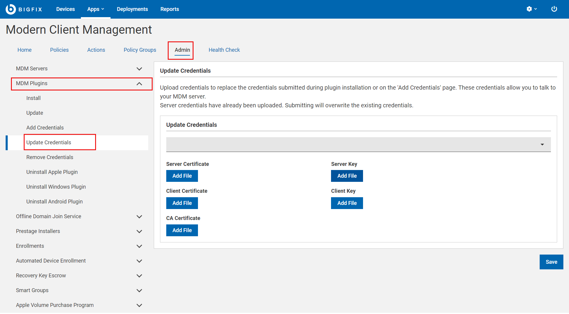 - The Upload Credentials drop-down lists the MDM servers in your environment. Select an MDM server for which you want to upload the credentials. For example, mdmserver.deploy.bigfix.com.