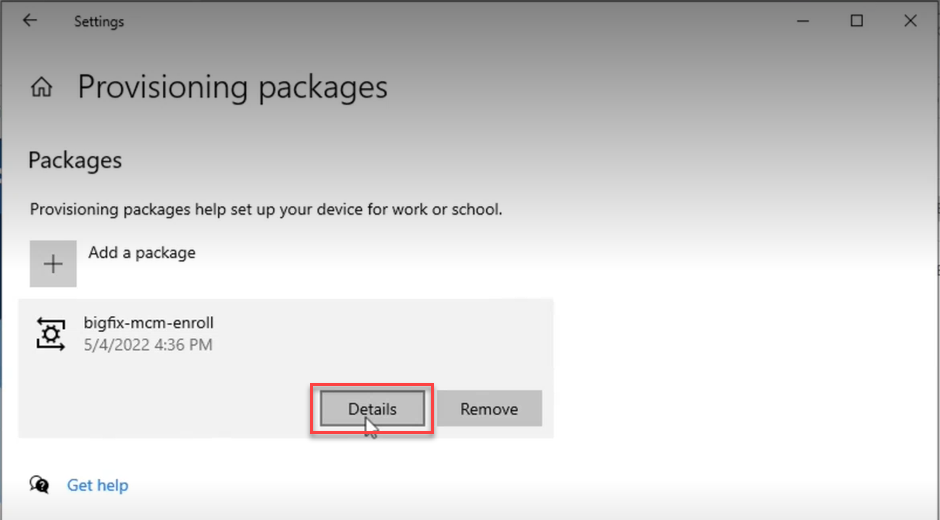 As a Device User, to view the configured provisional package details in the enrolled device, navigate to Settings > Accounts > Access work or school > Add or remove a provisioning package.
