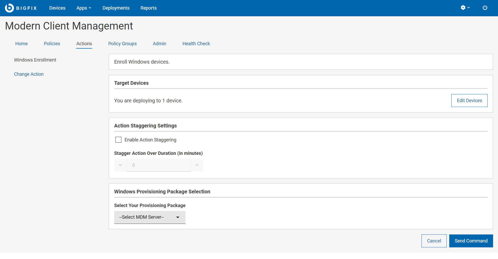 - A BigFix deployment is generated that initiates MDM enrollment on the selected devices.