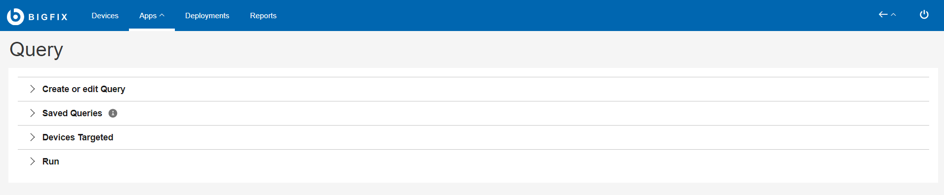 The sections in BigFix Query page is organized with accordions to provide a better visibility of the tasks to retrieve data from devices. You can expand or collapse the view.