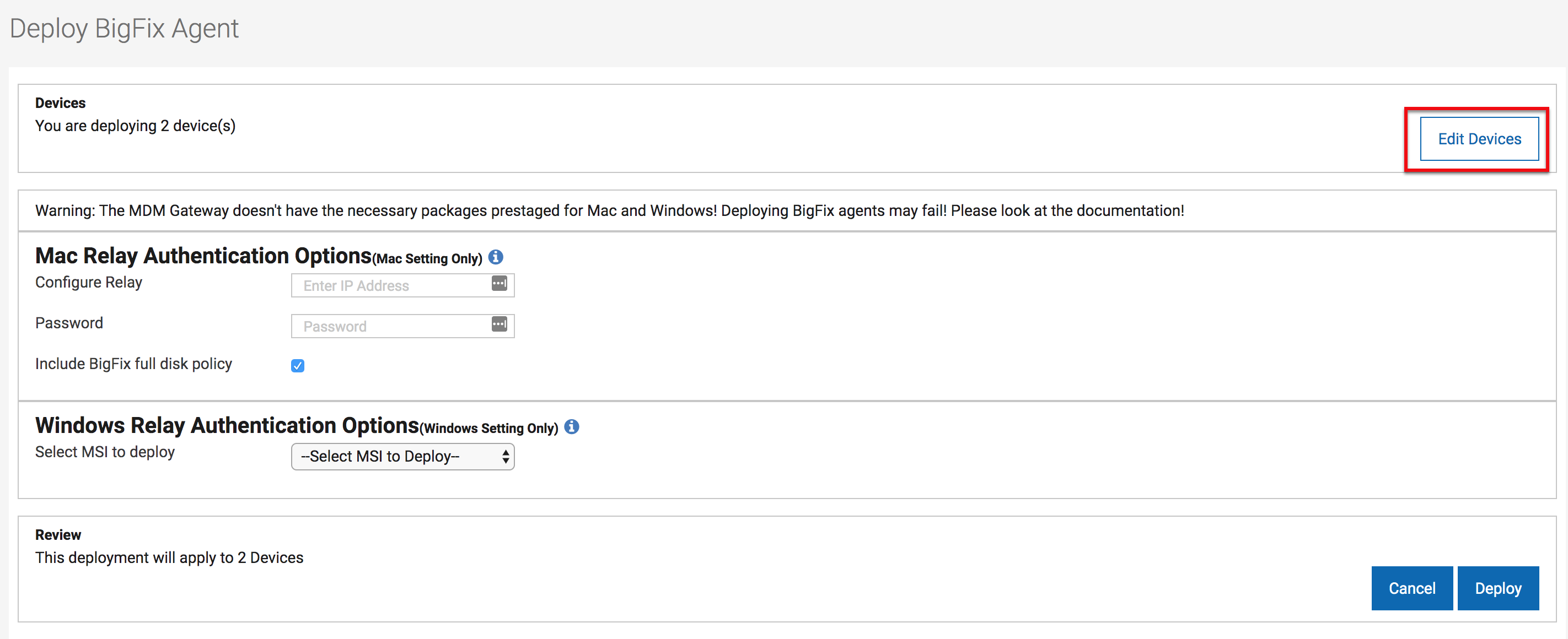 - Deploying the BigFix Agent works only if the installers for BigFix Agents are pre-staged on the MDM server. The BigFix WebUI requires at least one .pkg file for macOS and one .msi file for Windows™ devices. If installation packages are not on the MDM server, users receive a warning that says BigFix Agent actions will fail." The WebUI checks for .msi and .pkg files in the /var/opt/BESUEM/packages folder on the MDM server by default to see whether BigFix Agent packages are pre-staged correctly.