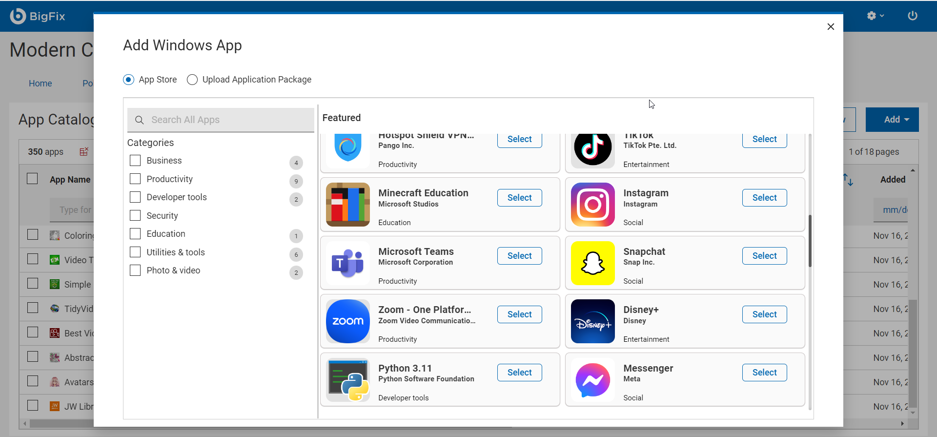 All the featured Windows store apps are displayed as tiles. Click Select