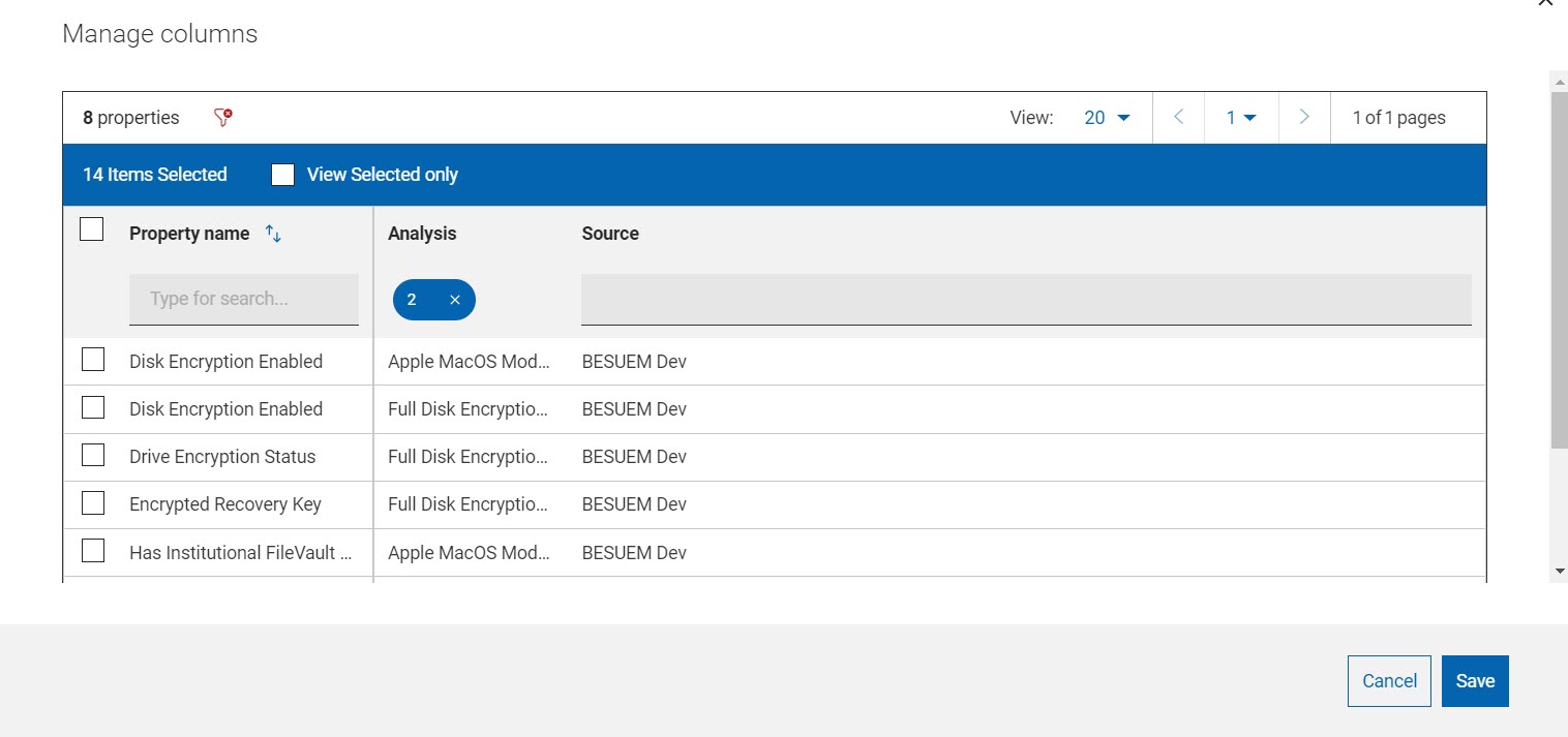 2. In the Manage columns window, search by string in the Property name field or in the Analysis column, select Full Disk Encryption.