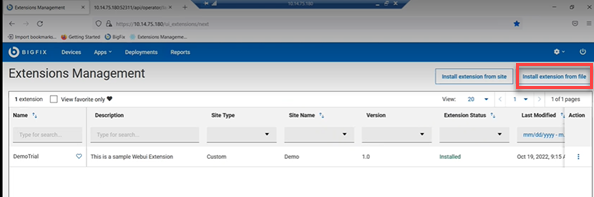 7. Once the extension is successfully installed, a success message is displayed and the extension is listed on the Extension Management grid.