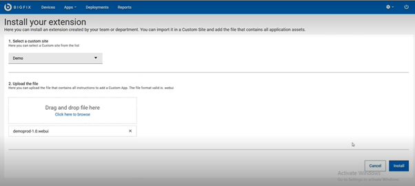 5. Upload the file that contains all instructions to add a custom app. The valid file format is .webui.