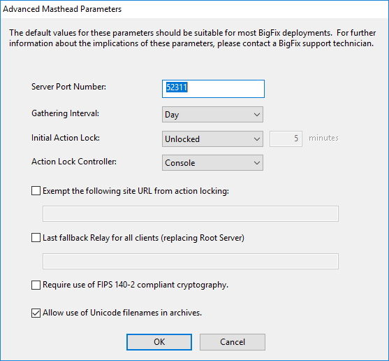 - Check this box to be compliant with the Federal Information Processing Standard in your network. This changes the masthead so that every BigFix component attempts to go into FIPS mode. By default, the client continues in non-FIPS mode if it fails to correctly enter FIPS, which might be a problem with certain legacy operating systems. Be aware that checking this box can add a few seconds to the client startup time.