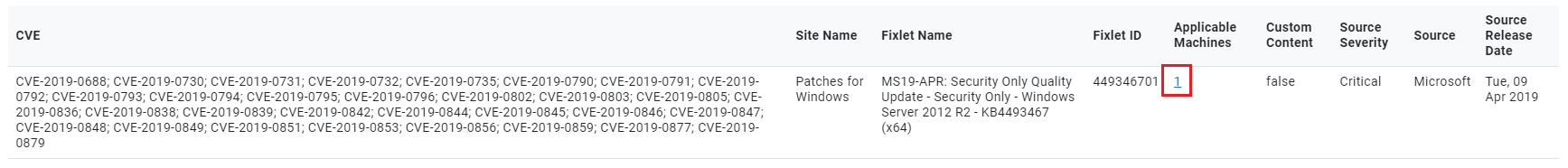 - Click on any number with a link to view more information such as CVE details, Fixlet details, and content as applicable.